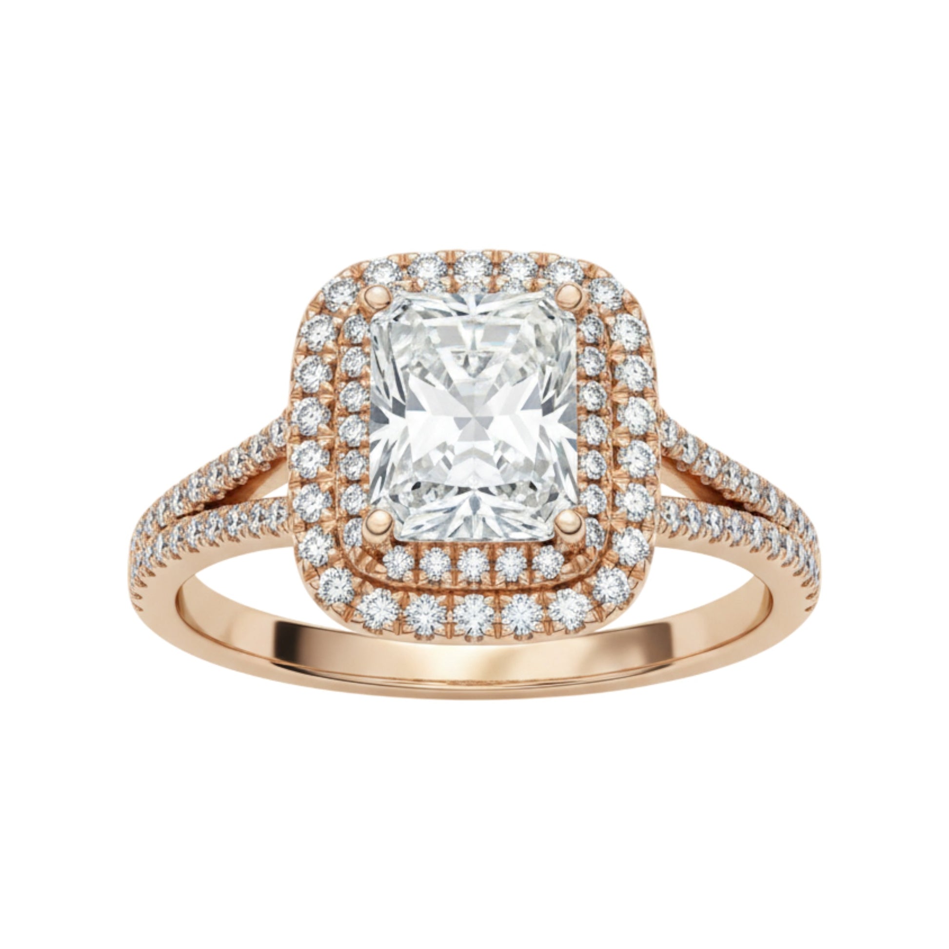 Crafted in luxurious 18KT gold, the setting blends classic glamour with modern sophistication. Diamond accents cascade down the band, adding even more sparkle to this showstopping piece. The double halo design not only enhances the center stone’s size and presence but also symbolizes the depth and strength of enduring love.