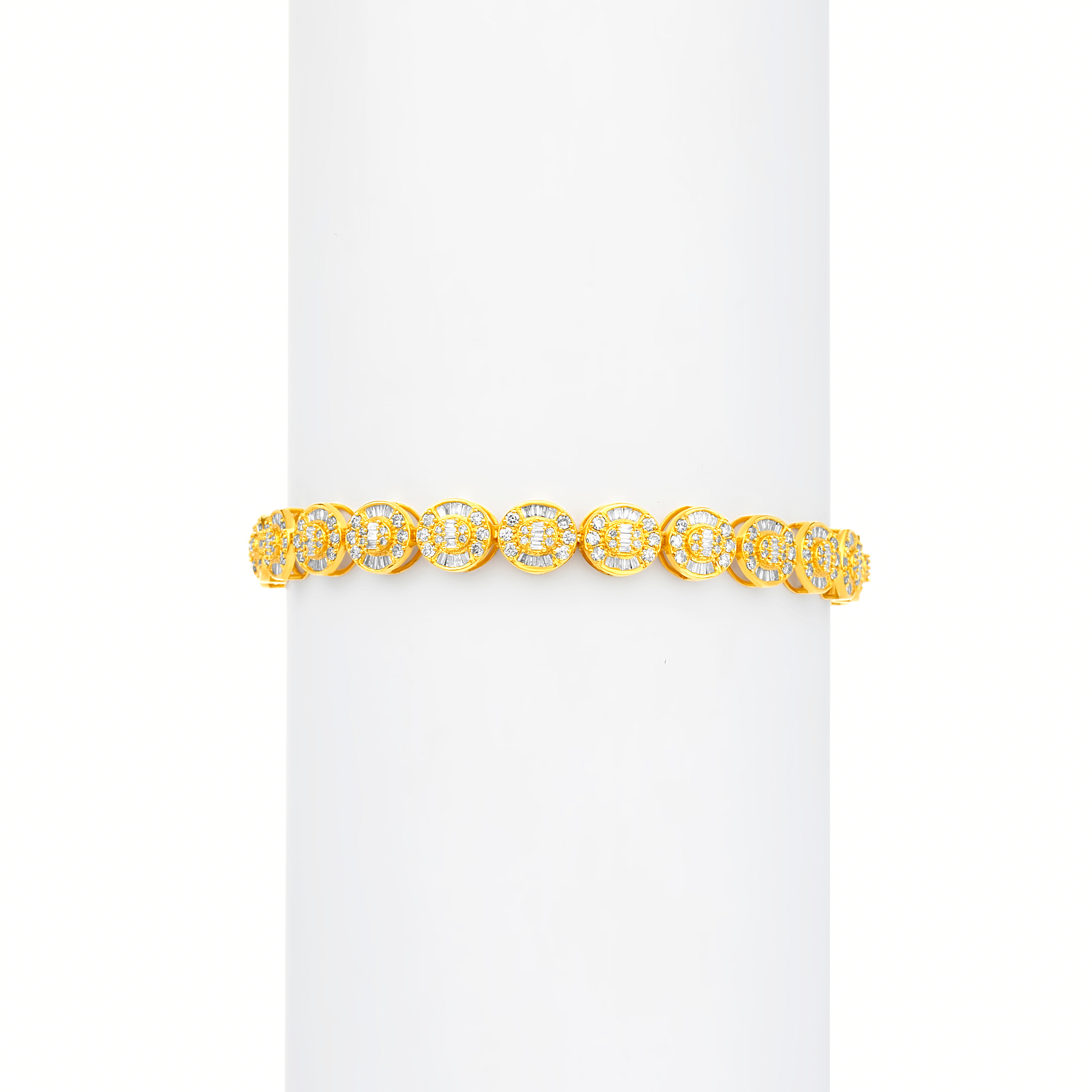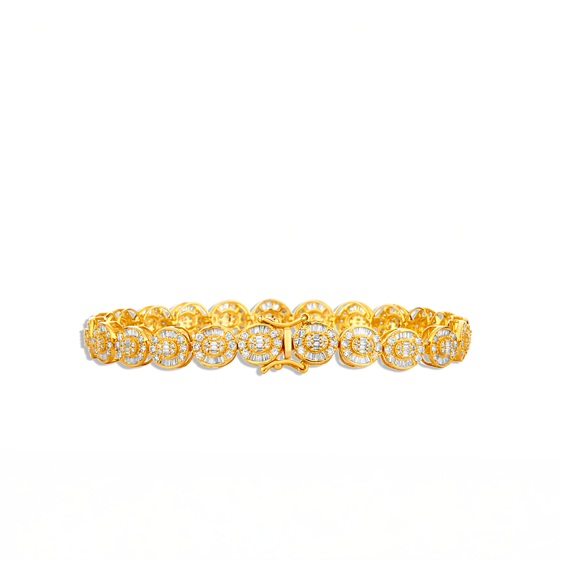 Timeless elegance meets modern brilliance in this meticulously crafted Oval Baguette Diamond Bracelet. Designed in lustrous 18 karat yellow gold, each oval link is set with a dazzling center cluster of brilliant-cut diamonds, encircled by a radiant halo of tapered baguette diamonds. The seamless design offers a continuous flow of sparkle and sophistication around the wrist.