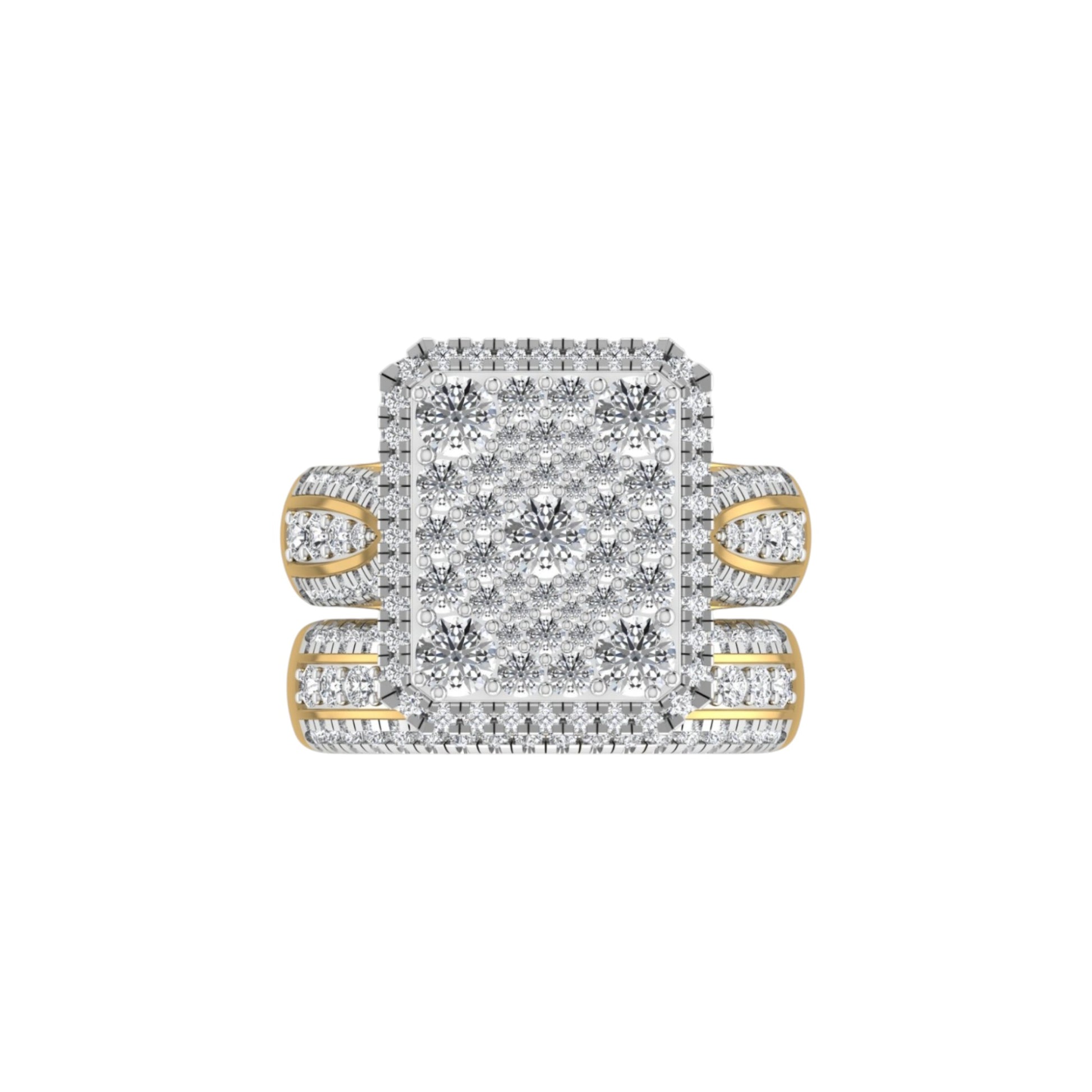The Amanda Radiant Cut Diamond Bride Set in 18 Karat Gold is a bold expression of brilliance and devotion, showcasing a dazzling radiant-cut diamond cluster centerpiece enhanced by rows of pavé-set natural diamonds that exude fire and sparkle. Handcrafted in luxurious 18K gold, the engagement ring is paired with a perfectly matching wedding band, creating a harmonious balance of elegance and grandeur. The radiant cut symbolizes clarity, strength, and enduring love, while the intricate diamond detailing reflects the richness of a love story destined to shine forever.