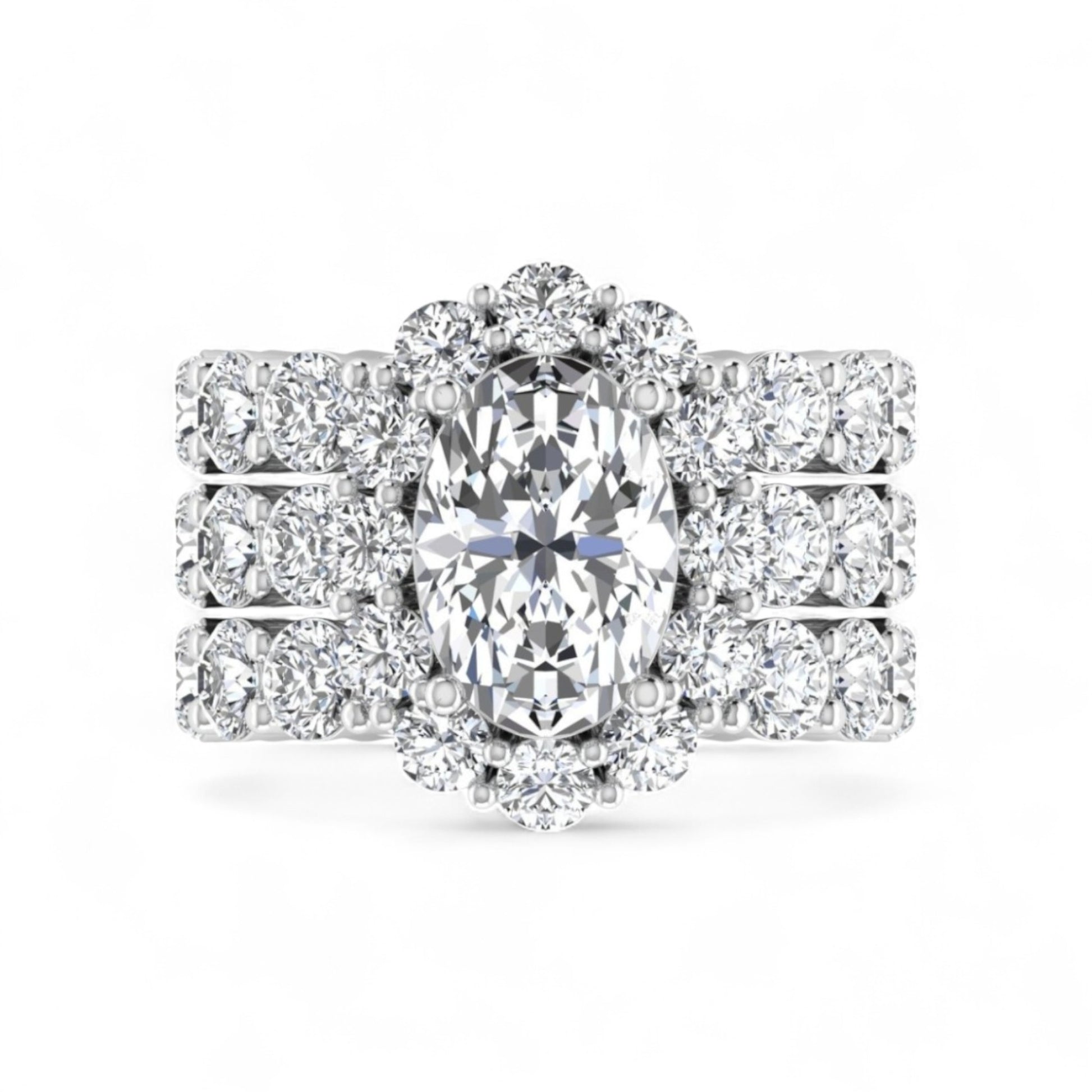 Unrivaled in brilliance and luxury, the Jane Oval Certified GIA Certified Natural Pavé Diamonds Bridal Set is designed for the bride who desires nothing less than extraordinary. At its heart, a stunning 3ct GIA certified oval-cut natural diamond radiates timeless elegance, symbolizing harmony, devotion, and grace. Surrounding the centerpiece, rows of meticulously set round brilliant natural diamonds create a bold, full-bodied brilliance that captures light from every angle.
