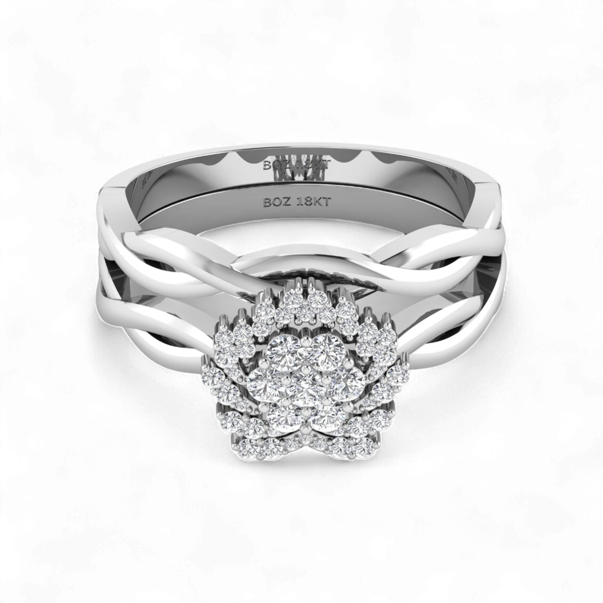 Radiant and timeless, the BOZ Forever Certified Natural Diamond Bride Set is a celebration of everlasting love. Handcrafted in warm 18 Karat gold, the centerpiece features a brilliant cluster of natural diamonds, intricately arranged to form a dazzling bloom of light. A halo of pavé-set diamonds enhances its brilliance, while the twisted band design symbolizes the unbreakable bond of two souls woven together in love.