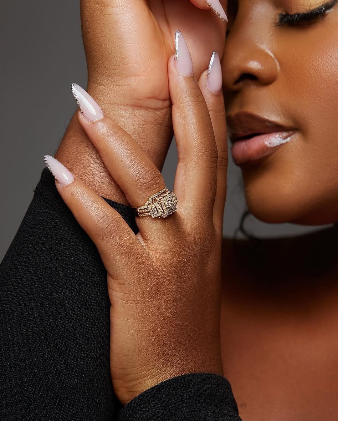 The Regina Radiant Cut Natural Diamond Cluster Bride Set in 18 Karat Gold is a bold celebration of brilliance and eternal devotion, featuring a radiant-cut inspired cluster centerpiece surrounded by layered halos of natural diamonds that magnify its sparkle. Handcrafted in luxurious 18K gold, the engagement ring’s intricate wide band design shimmers with pavé-set diamonds, flawlessly paired with a matching wedding band for a harmonious finish. The radiant cut, admired for its fire and clarity, symbolizes strength, passion, and timeless elegance, making this bridal set the perfect choice for the bride who desires opulence, sophistication, and a love that shines without end.