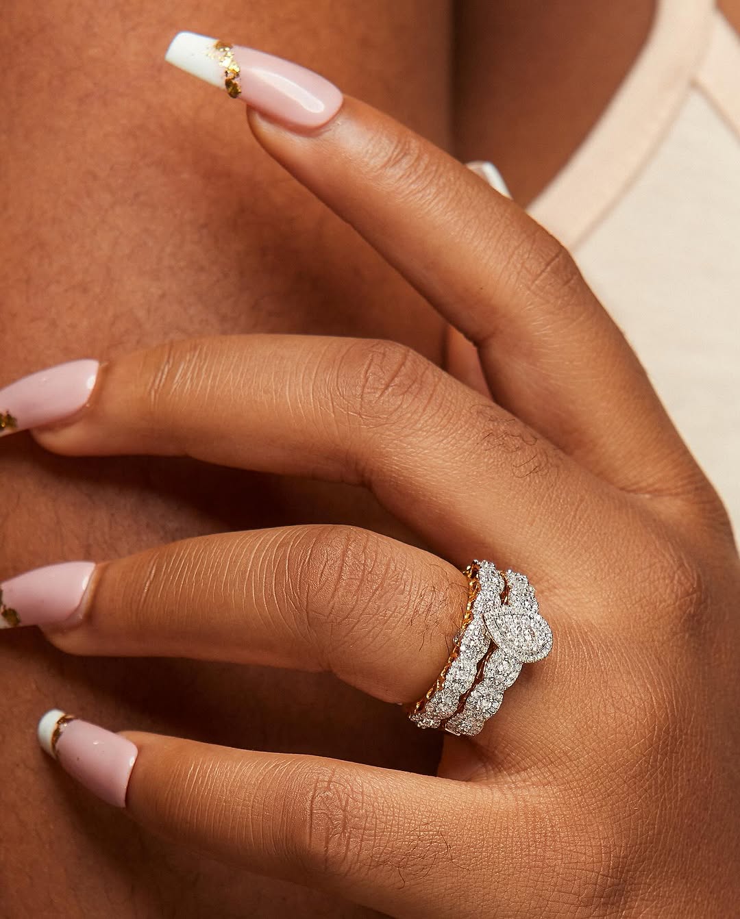 The Ruby Pear Cut Diamond Cluster Bride Set in 18 Karat Gold is a breathtaking celebration of passion and devotion, designed with a striking pear-cut ruby at its center, encircled by a brilliant cluster of natural diamonds that amplify its fiery elegance. Handcrafted in luminous 18K gold with a diamond-studded band and matching wedding ring, this set radiates timeless sophistication. Symbolizing tears of joy and eternal romance, the pear silhouette paired with the vibrant ruby reflects a love that is bold, radiant, and everlasting, making this bride set the perfect emblem of forever.