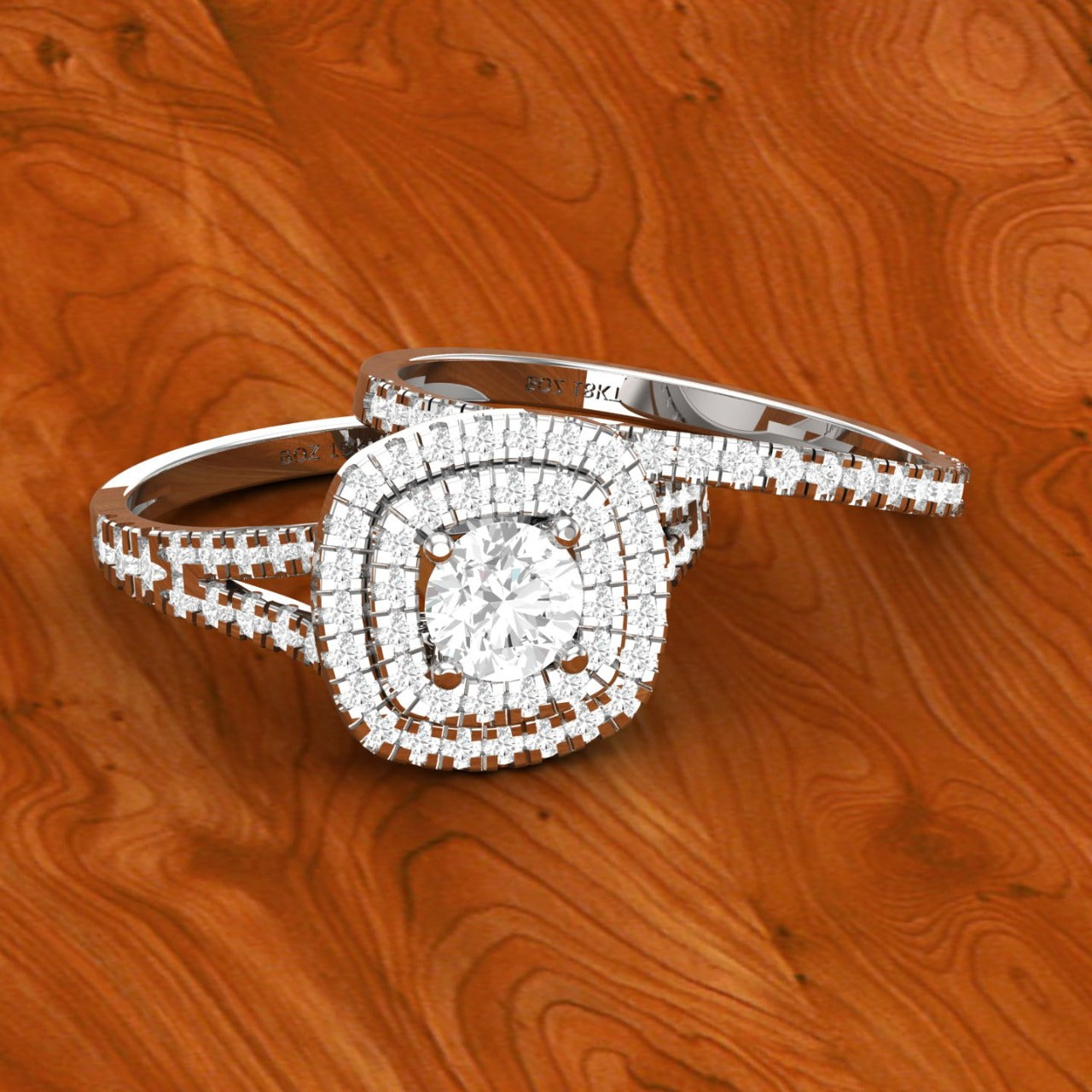 The Audre Round Cut Natural Diamonds Cluster Bride Set in 18K Gold is a radiant masterpiece of brilliance and devotion, featuring a round-cut center diamond surrounded by a breathtaking cushion-shaped cluster of halos that magnify its sparkle. Handcrafted in luminous 18K gold, the engagement ring’s split shank is adorned with pavé-set diamonds for added fire, perfectly paired with a matching wedding band that completes the look with timeless harmony. The round cut embodies eternal love and unity, while the intricate cluster design symbolizes the strength and beauty of a love that grows brighter with every moment.