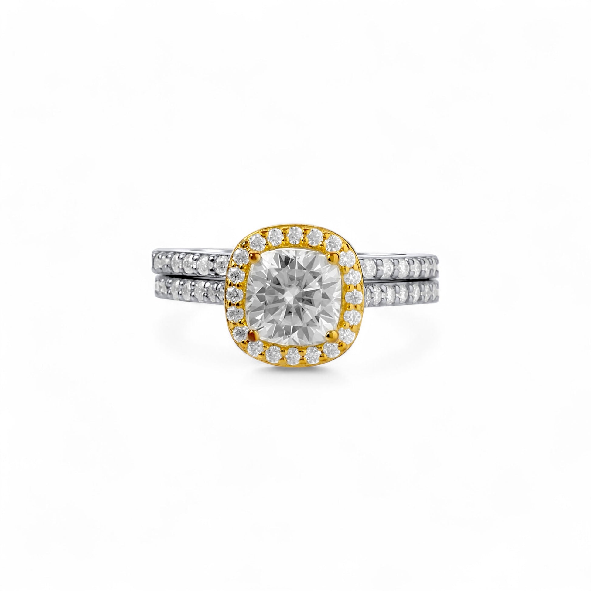 The Classic Cushion Cut Two Tone Moissanite Bride Set in 925 Sterling Silver is a timeless statement of romance and sophistication, featuring a cushion-cut moissanite centerpiece encircled by a radiant halo of pavé stones for unmatched brilliance. Designed in a striking two-tone finish, the warm glow of gold accents enhances the polished sterling silver band, creating a look that is both modern and classic. Paired with a matching pavé-set wedding band, this set symbolizes eternal love and harmony, making it the perfect choice for the bride who desires elegance, brilliance, and a love that lasts forever.