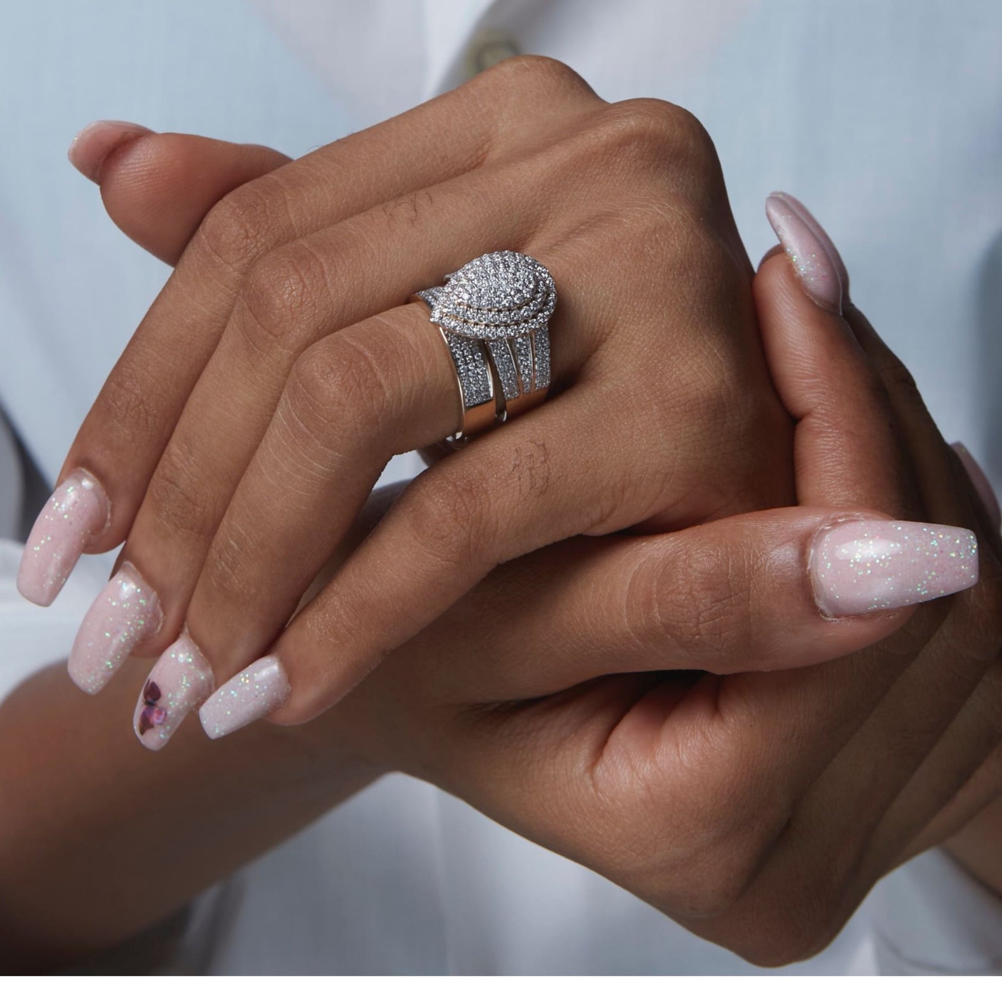 The Omoni Pear Cut Natural Diamond Cluster Bride Set is a radiant symbol of romance and devotion, showcasing a bold pear-shaped cluster of natural diamonds that sparkles with unmatched brilliance. Handcrafted in luminous 18KT gold, the engagement ring features a dramatic layered design of pavé-set diamonds that flow seamlessly into the band, paired with a matching wedding ring adorned in diamonds for continuous sparkle. The pear cut, often called the teardrop of joy, represents deep emotion and everlasting love, making this bridal set a dazzling choice for the bride who desires both grandeur and timeless elegance.