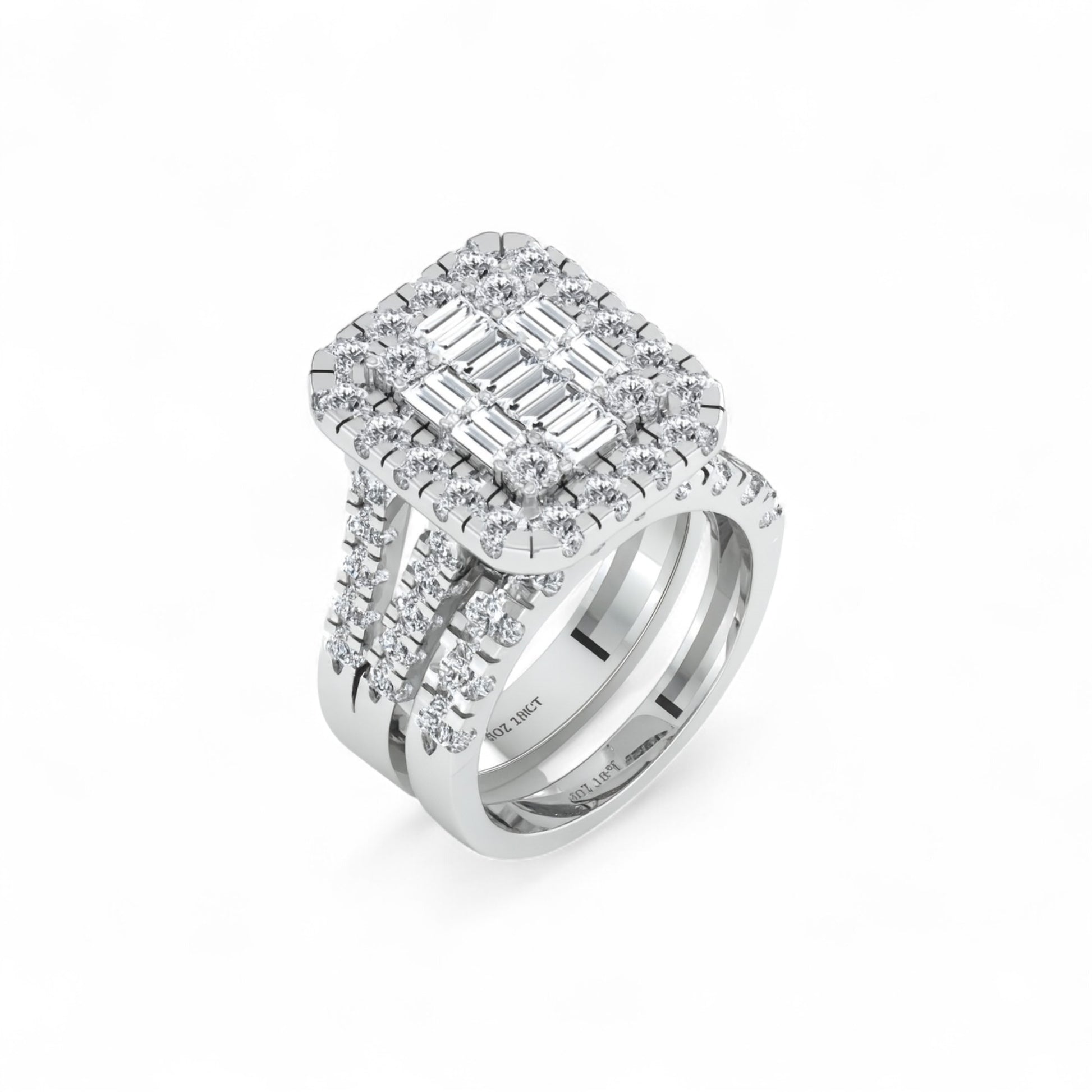 The Zoe Radiant Cut Diamond Bride Set in 18 Karat Gold is a bold expression of elegance and brilliance. Featuring a radiant-cut diamond centerpiece surrounded by baguette and round diamond accents, this intricate design is enhanced with a double halo and a diamond-encrusted split shank. Paired with a perfectly matching band, the set sparkles with sophistication and timeless beauty, all crafted in luxurious 18K gold.