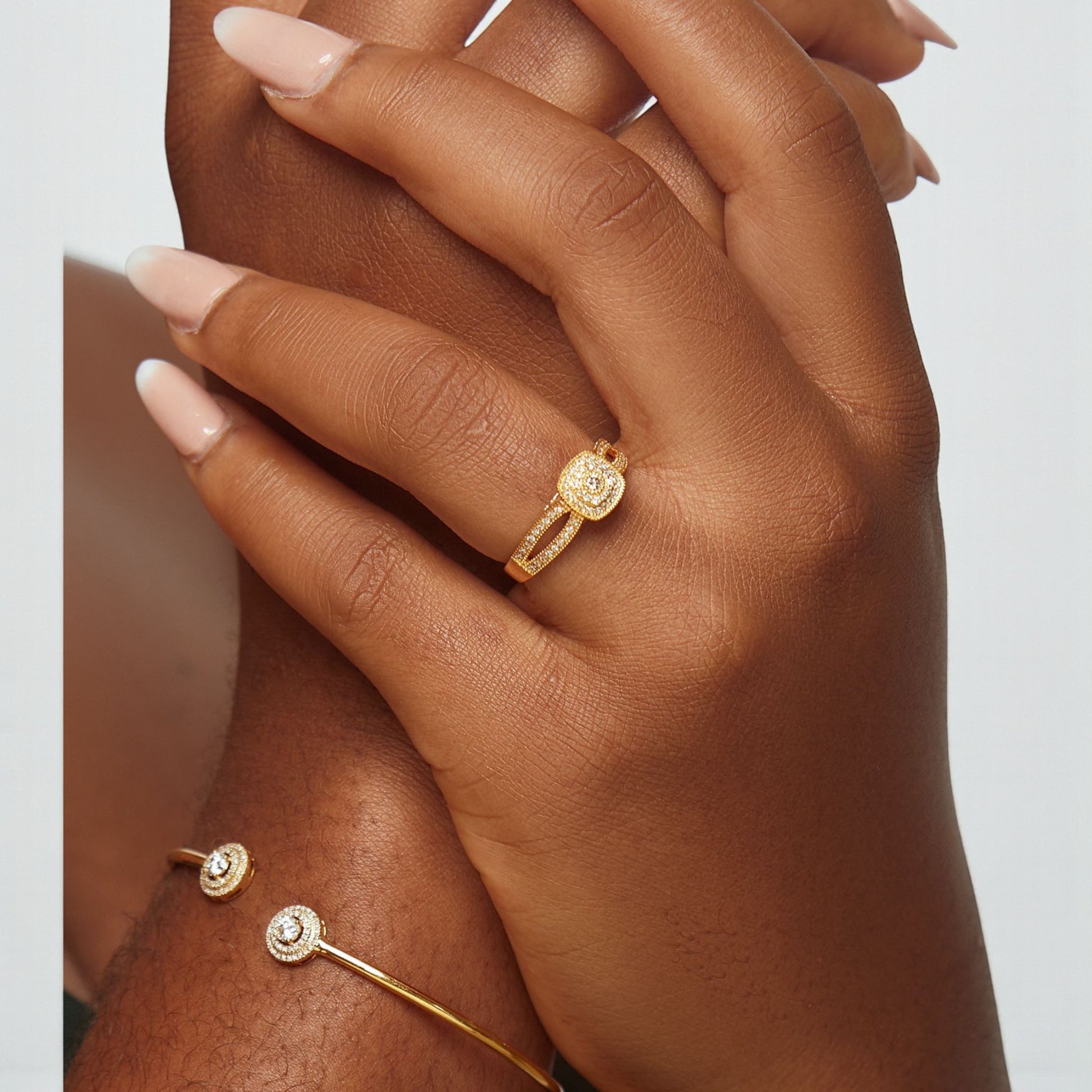 The Cherry Cushion Cut Natural Diamond Cluster Engagement Ring in is a dazzling symbol of elegance and devotion, featuring a brilliant cushion-shaped cluster of natural diamonds that radiate unmatched sparkle. Handcrafted in luxurious 18K gold, the ring’s split shank design is lined with pavé-set diamonds, drawing the eye toward the radiant centerpiece. The cushion cluster design embodies unity and brilliance, symbolizing the many cherished moments that come together to form an everlasting love. Perfect for the bride who desires timeless sophistication with a modern edge, the Cherry Ring reflects BOZ’s promise of love refined, luxury defined, and forever treasured.