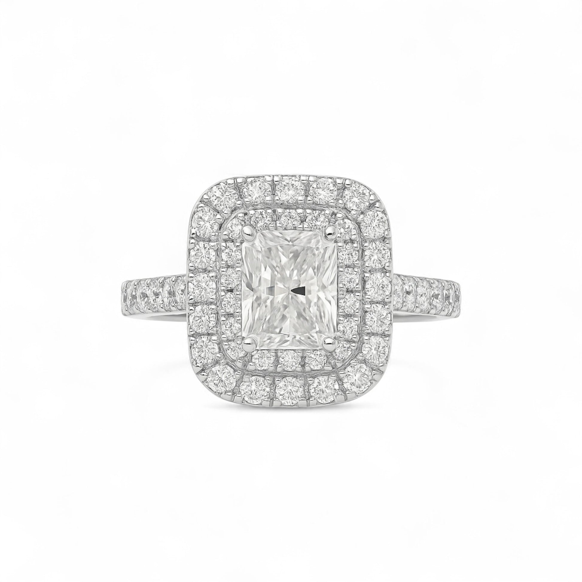 Radiant and captivating, the Classic Double Halo Moissanite Engagement Ring is a timeless treasure crafted in luminous 18 Karat gold. At its heart lies a dazzling radiant-cut moissanite, designed to capture light with unmatched brilliance. Surrounding the centerpiece, a double halo of sparkling stones enhances its fire, while the pavé-set band adds extra shimmer and sophistication.