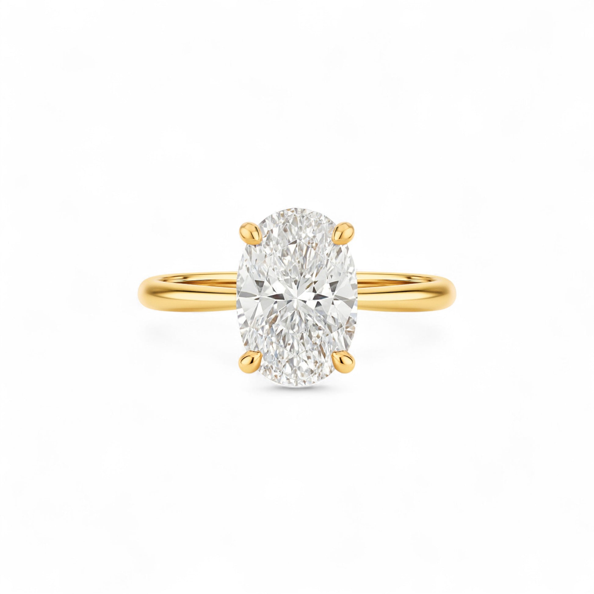 Crafted in luminous 18K gold, this engagement ring embodies the elegance of timeless simplicity. At its heart sits a dazzling oval-cut VVS1 D Moissanite, available in 3ct or 4.5ct, radiating fire and brilliance from every angle. Beneath the center stone lies a hidden crown of natural diamonds, adding depth and sparkle with every movement, a secret detail only the wearer truly knows. Its sleek solitaire design offers a refined balance between classic sophistication and modern allure, making it a versatile treasure for a lifetime.