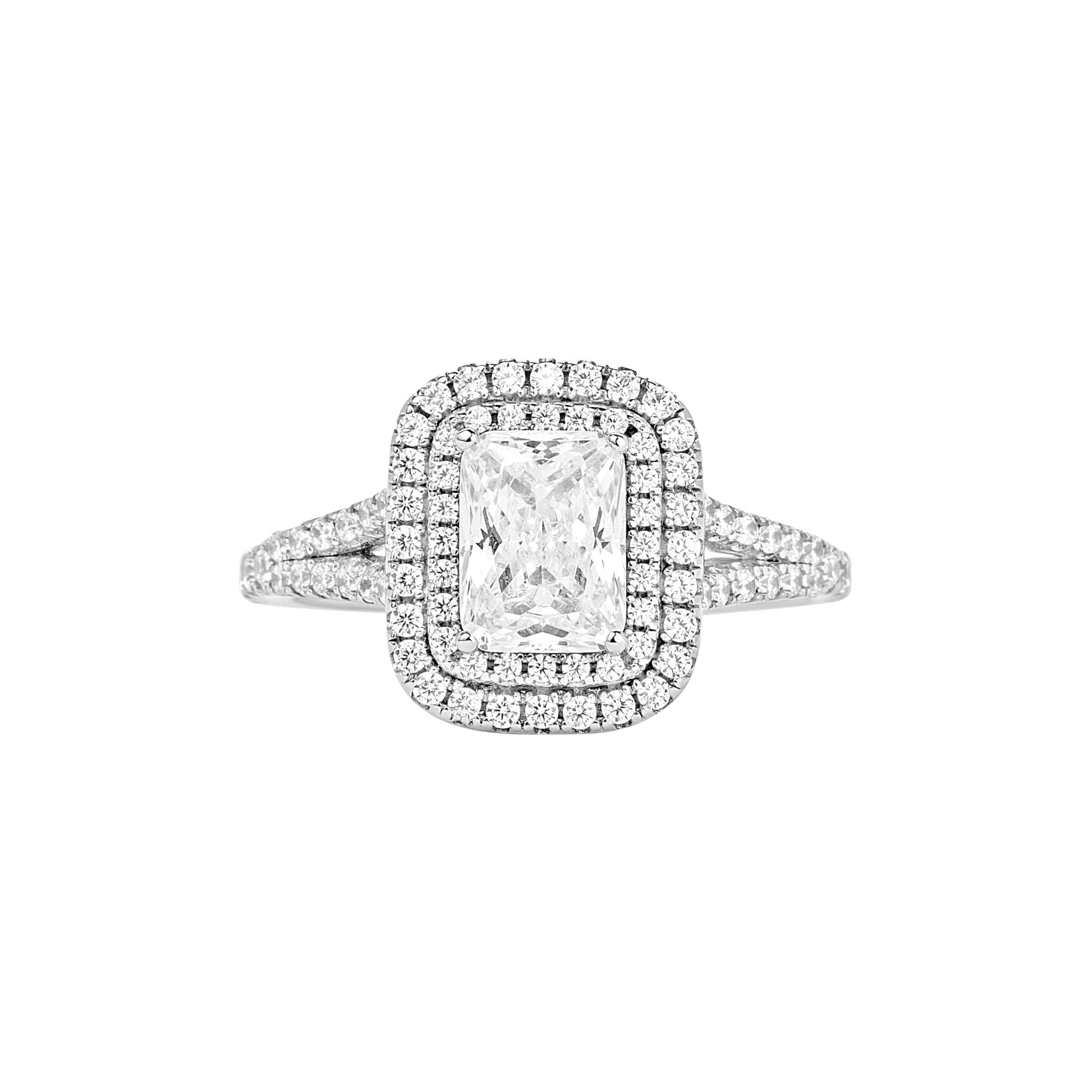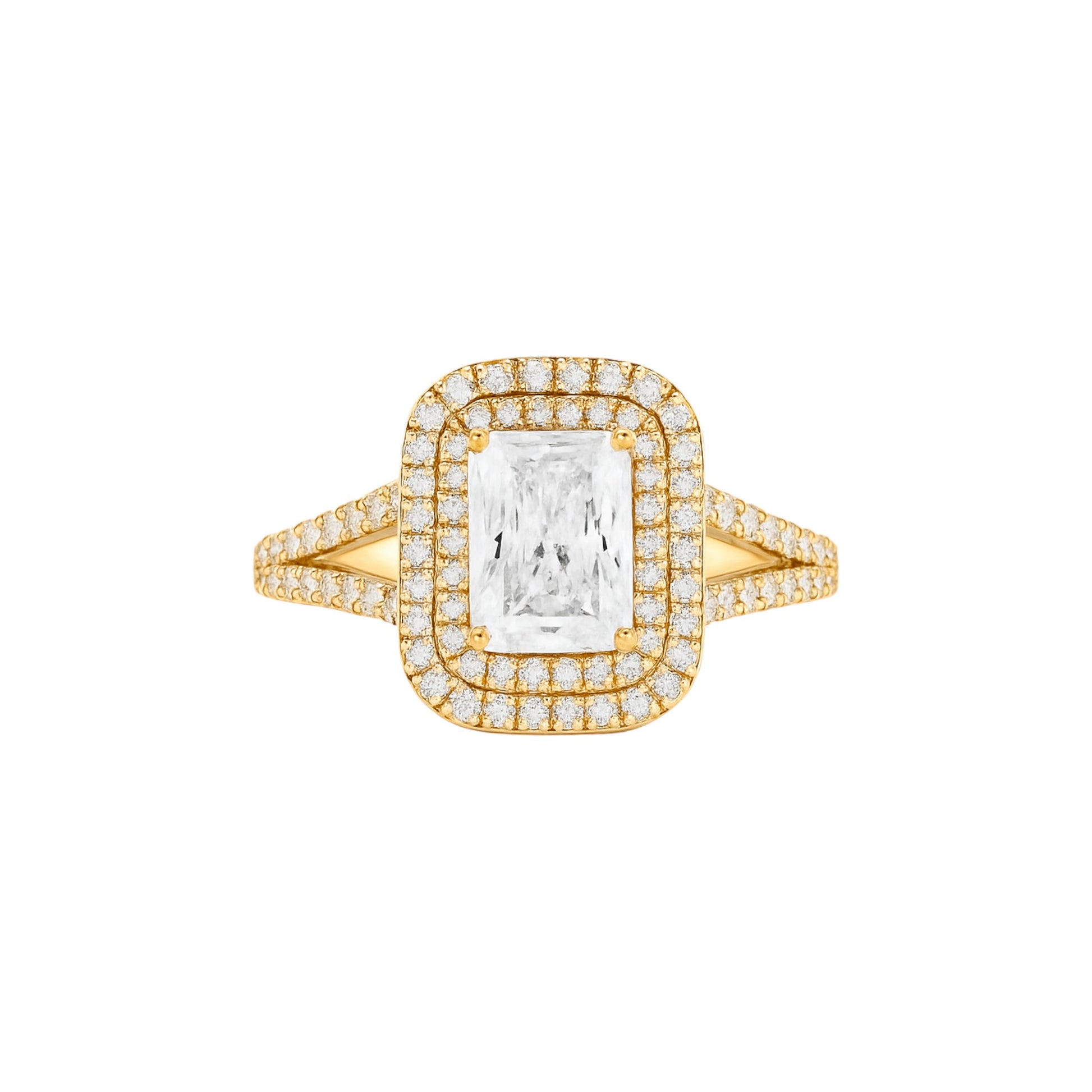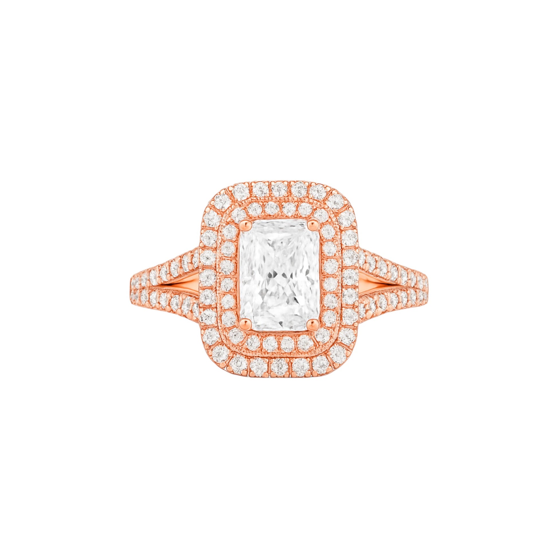 Elegant and luminous, the Kylie Engagement Ring is designed to dazzle with timeless brilliance. Crafted in warm 10 Karat gold, this masterpiece features a radiant-cut moissanite center stone that captures light with breathtaking fire. Surrounding the centerpiece, a double halo of natural diamonds amplifies its sparkle, while the split shank, lined with pavé-set diamonds, adds depth and sophistication.