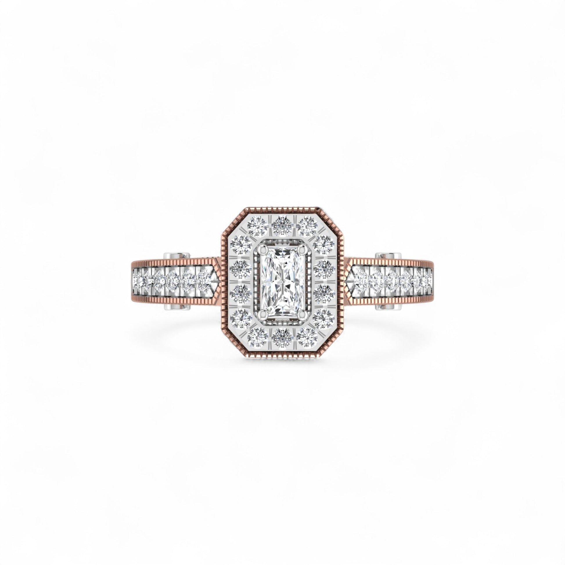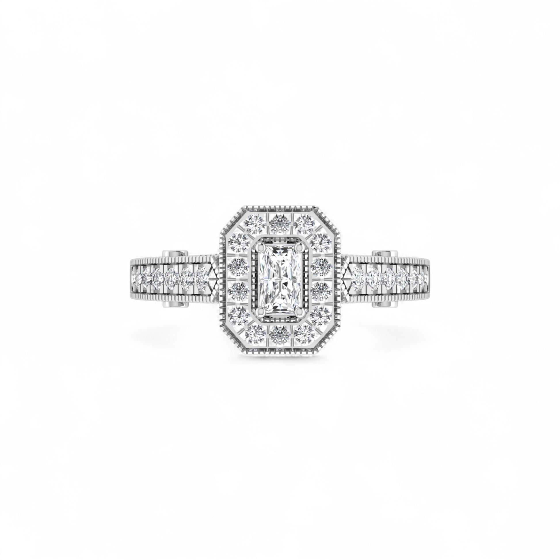 The Nala Radiant Natural Diamond Engagement Ring in 18 Karat Gold is a masterpiece of timeless elegance. Featuring a radiant-cut natural diamond at the center, framed by a bold octagon-shaped halo of brilliant diamonds and a pavé-set band, this design combines striking geometry with refined sparkle. Crafted in polished 18K gold, it’s built to last as beautifully as the love it represents.