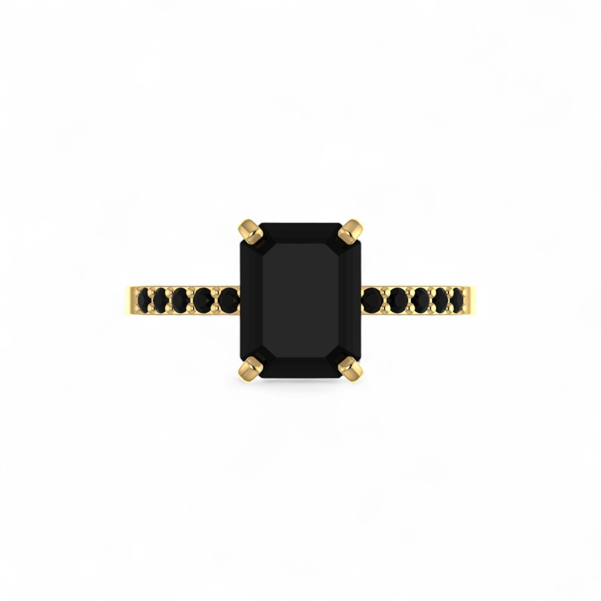 Bold, modern, and unforgettable, the No Halo Black Emerald Cut Moissanite Engagement Ring is a statement of love like no other. Handcrafted in radiant 18 Karat gold, this design features a striking black emerald-cut moissanite at its center, celebrated for its dramatic elegance and timeless geometry. The sleek no-halo setting allows the stone’s bold beauty to shine, while pavé-set black moissanite along the band adds depth and refined brilliance.