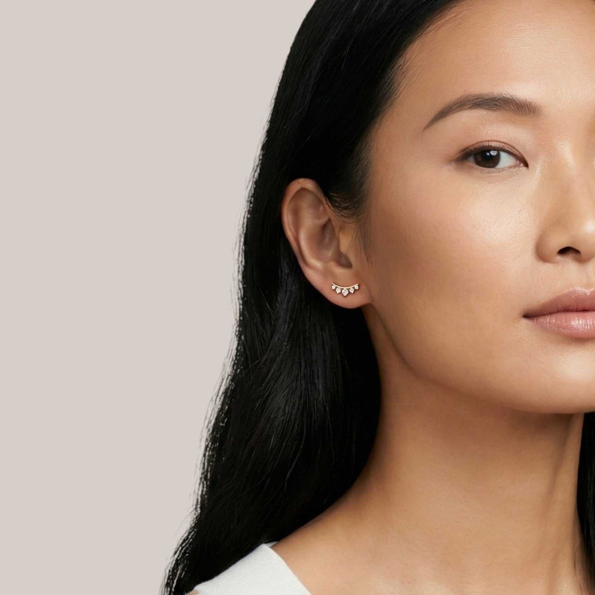 The stunning Labret Cartilage Diamond Studs featuring a cascading curve of round-cut diamonds delicately framed with gold prongs. Designed for a secure and graceful fit, this piece adds just the right shimmer to any ear stack with a soft, sculptural brilliance that hugs the cartilage line.