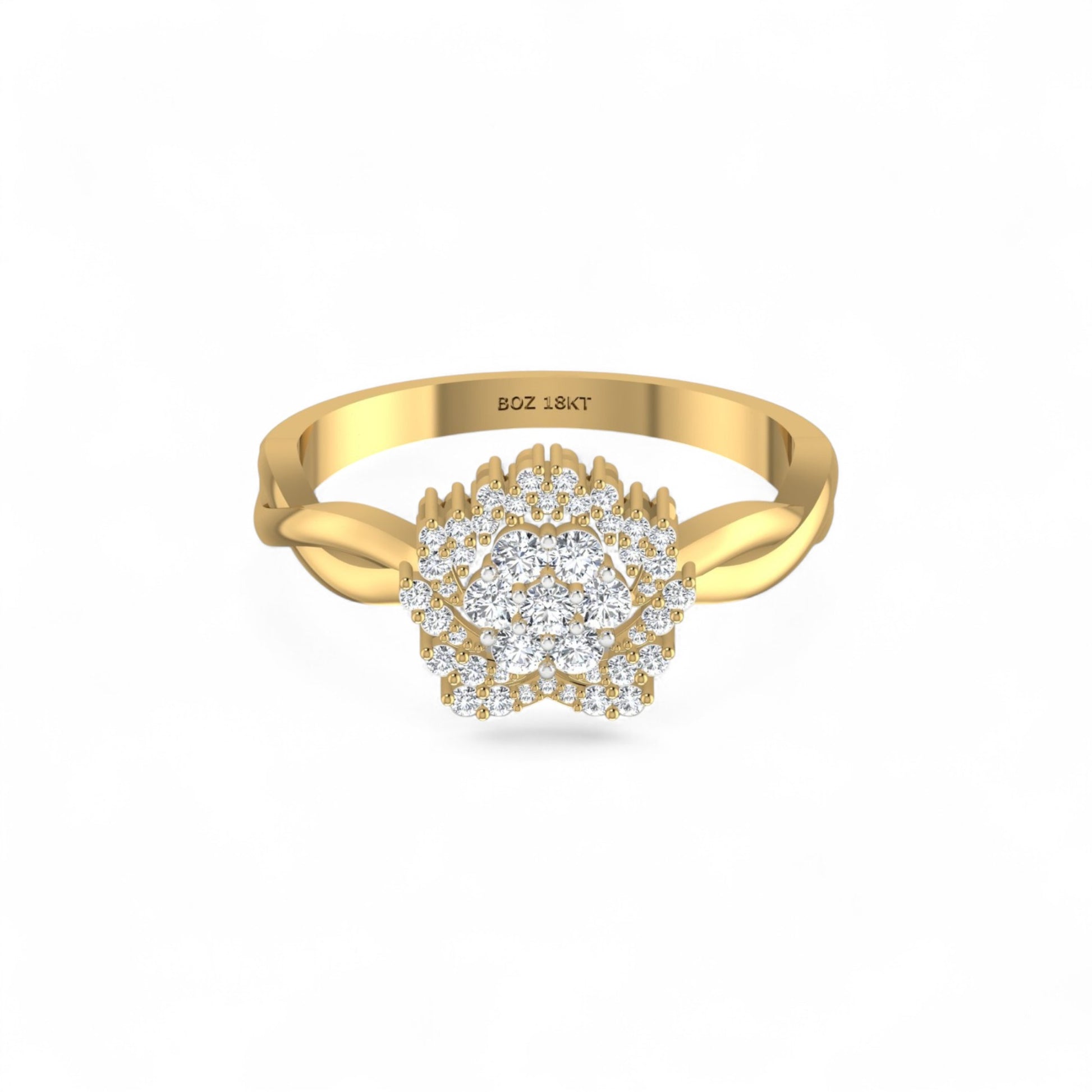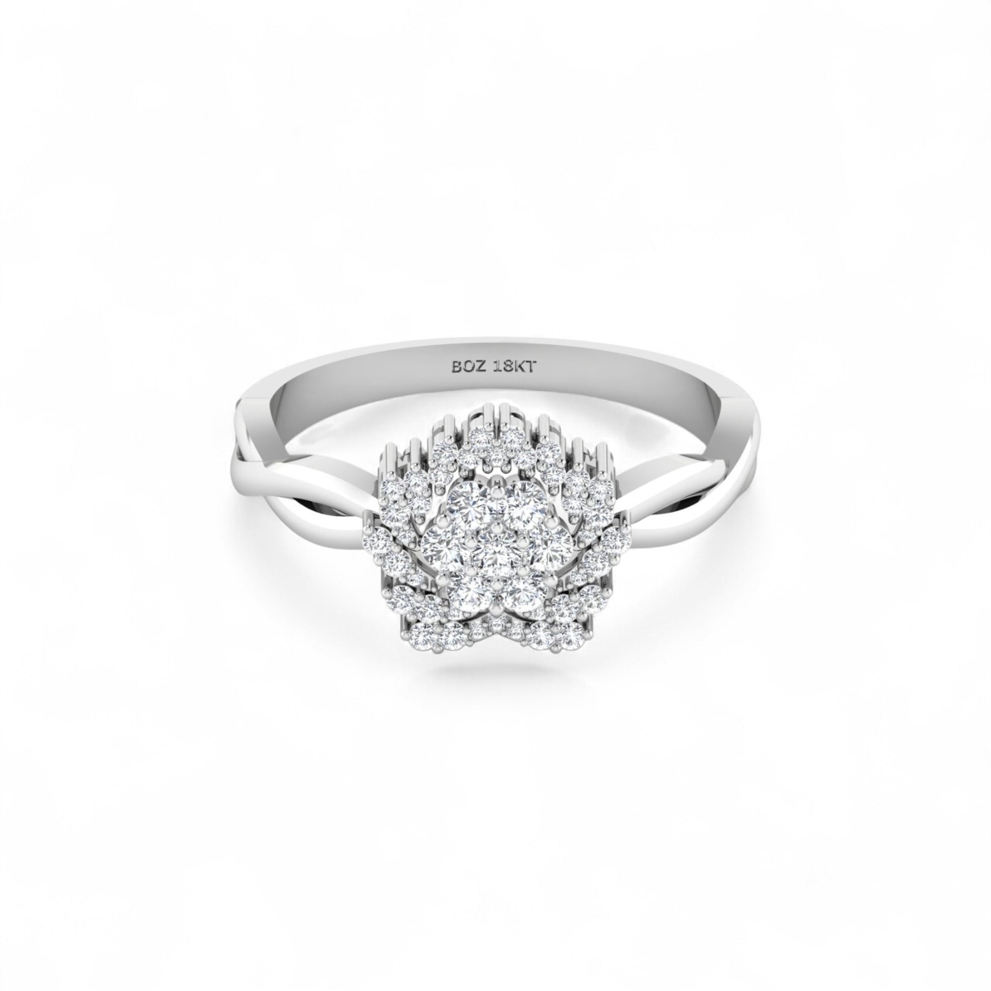 The BOZ Forever Natural Diamond Engagement Ring in 18 Karat Gold is a masterpiece of elegance and brilliance. Featuring a radiant floral-inspired cluster of natural diamonds set in lustrous 18K gold, this ring sparkles from every angle while its twisted band adds a touch of modern sophistication.