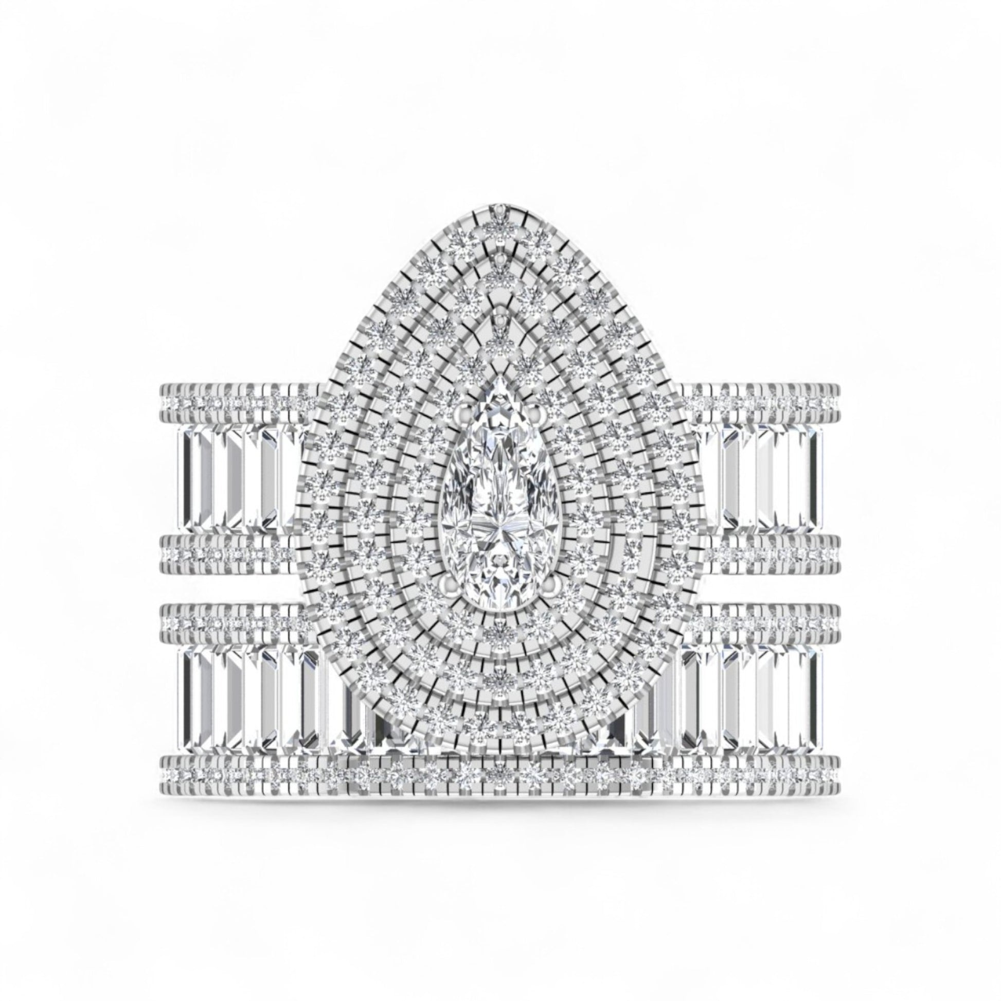 The Doris Pear Cut Certified Pavé Diamonds Bride Set in 18 Karat Gold is a radiant masterpiece of elegance and devotion, featuring a stunning pear-cut center diamond embraced by a brilliant double halo of pavé-set round diamonds. Handcrafted in luminous 18K gold, the set is further elevated with rows of channel-set baguette diamonds along the band, creating a captivating blend of fire and sophistication. The pear cut, often called the teardrop of joy, symbolizes romance and enduring love, while the intricate detailing of this design reflects the strength and brilliance of a forever bond. Crafted for the bride who desires both grandeur and timeless elegance, the Doris Bride Set is a dazzling testament to love that shines endlessly.