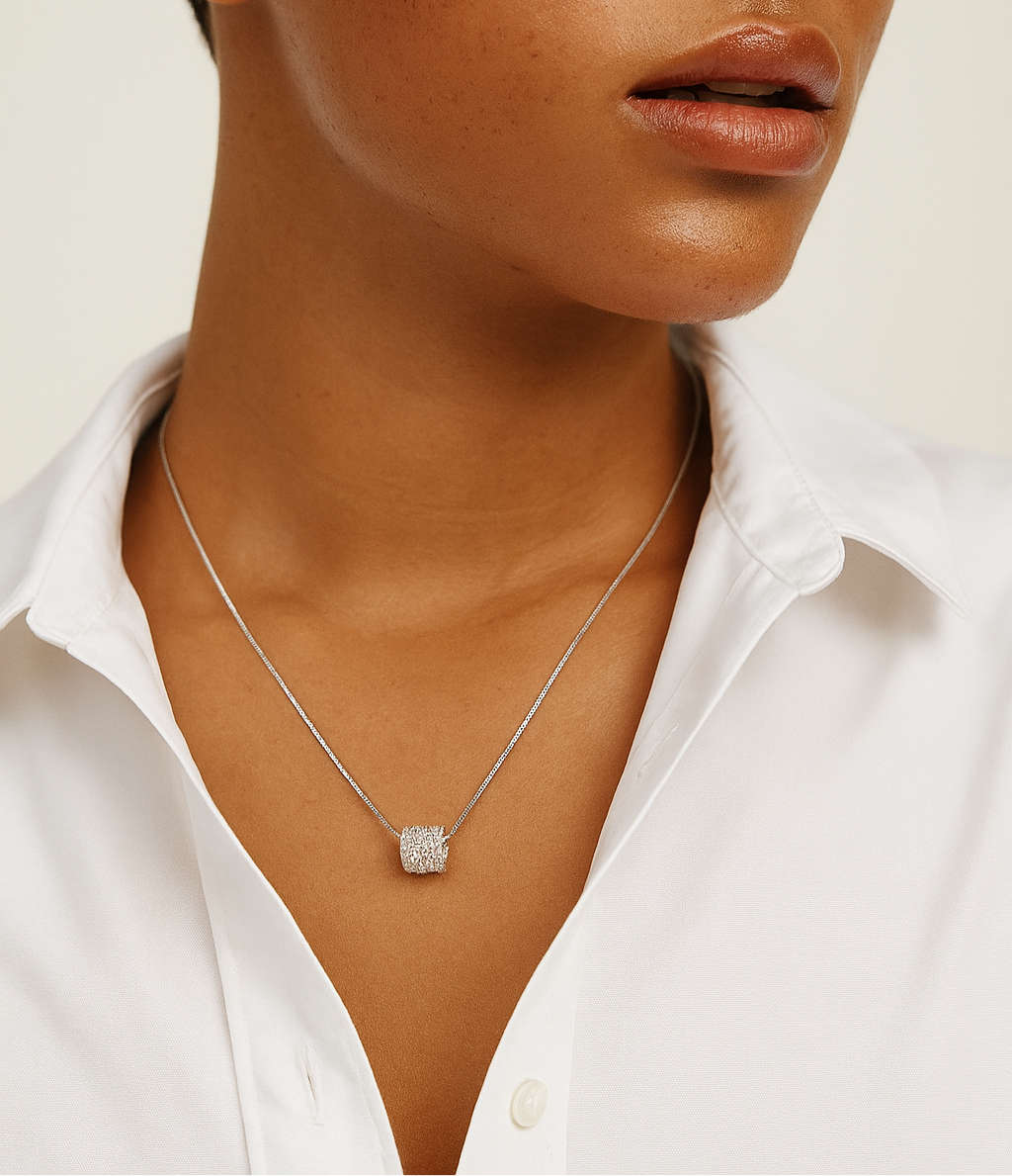 Minimalist in form, yet radiant in detail, the Barrel Moissanite Necklace in 925 Sterling Silver is a modern classic. Featuring a polished barrel-shaped pendant set with brilliant moissanite stones, this necklace exudes effortless elegance and contemporary style.
