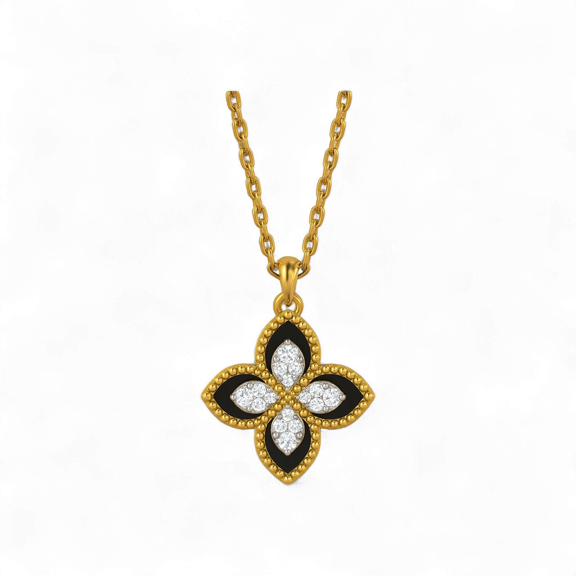Elegant and symbolic, the Dual Clover Agate Diamond Pendant Necklace in 18K Gold is a stunning fusion of natural beauty and refined craftsmanship. Featuring two intricately crafted clover motifs, one adorned with luminous white agate and the other with radiant natural diamonds, this pendant captures the essence of luck, harmony, and grace.
