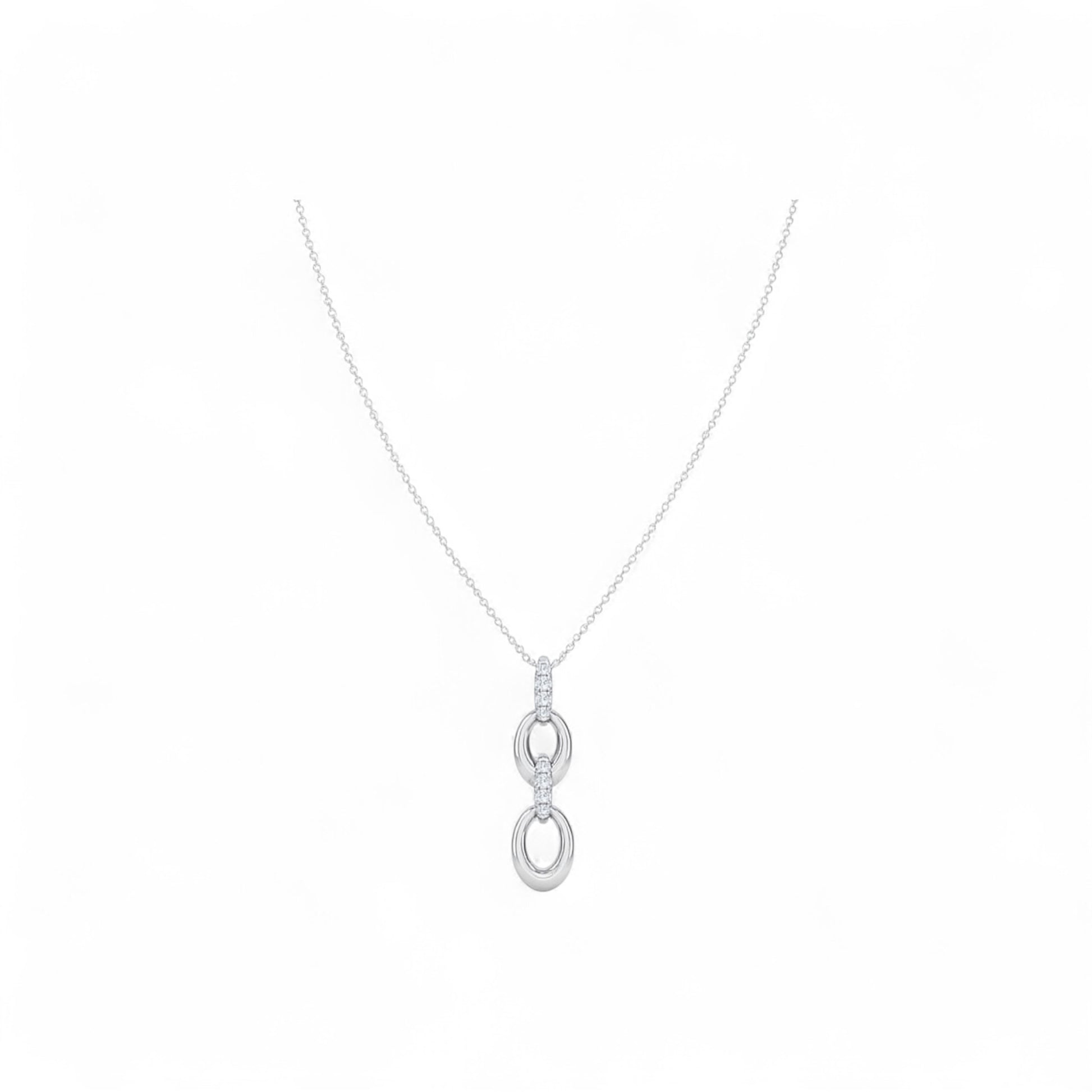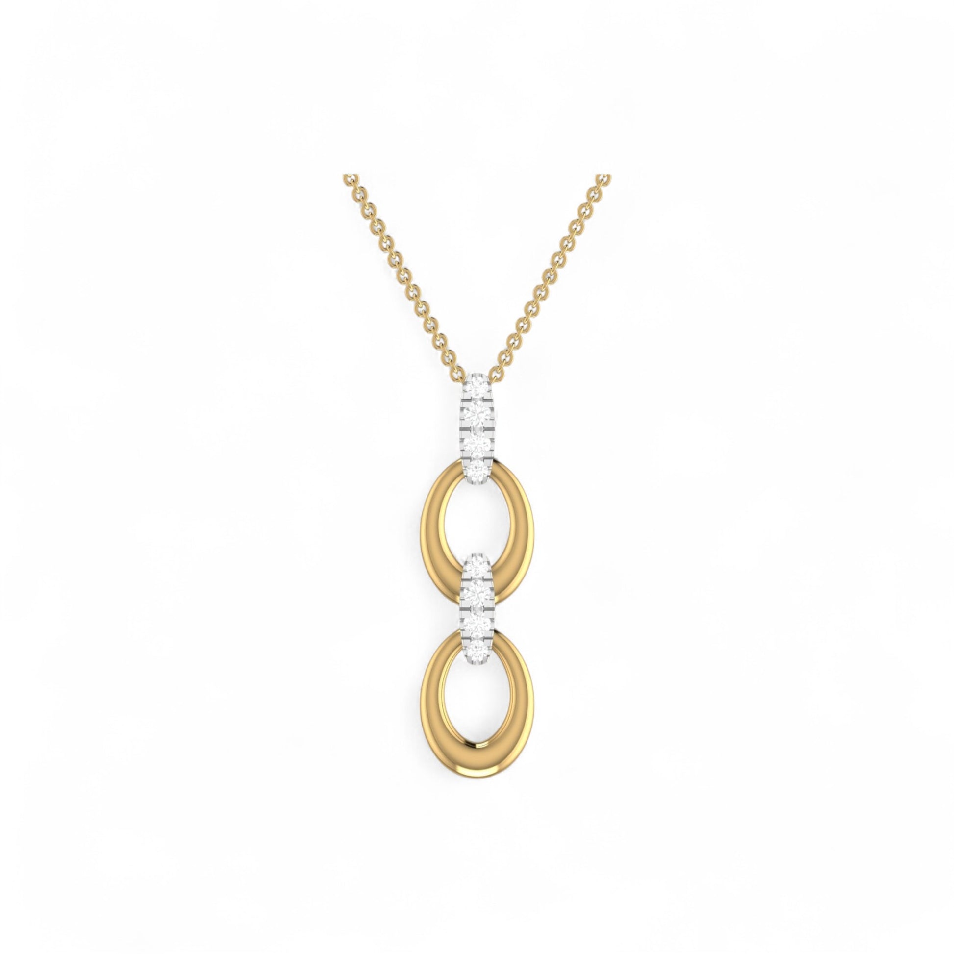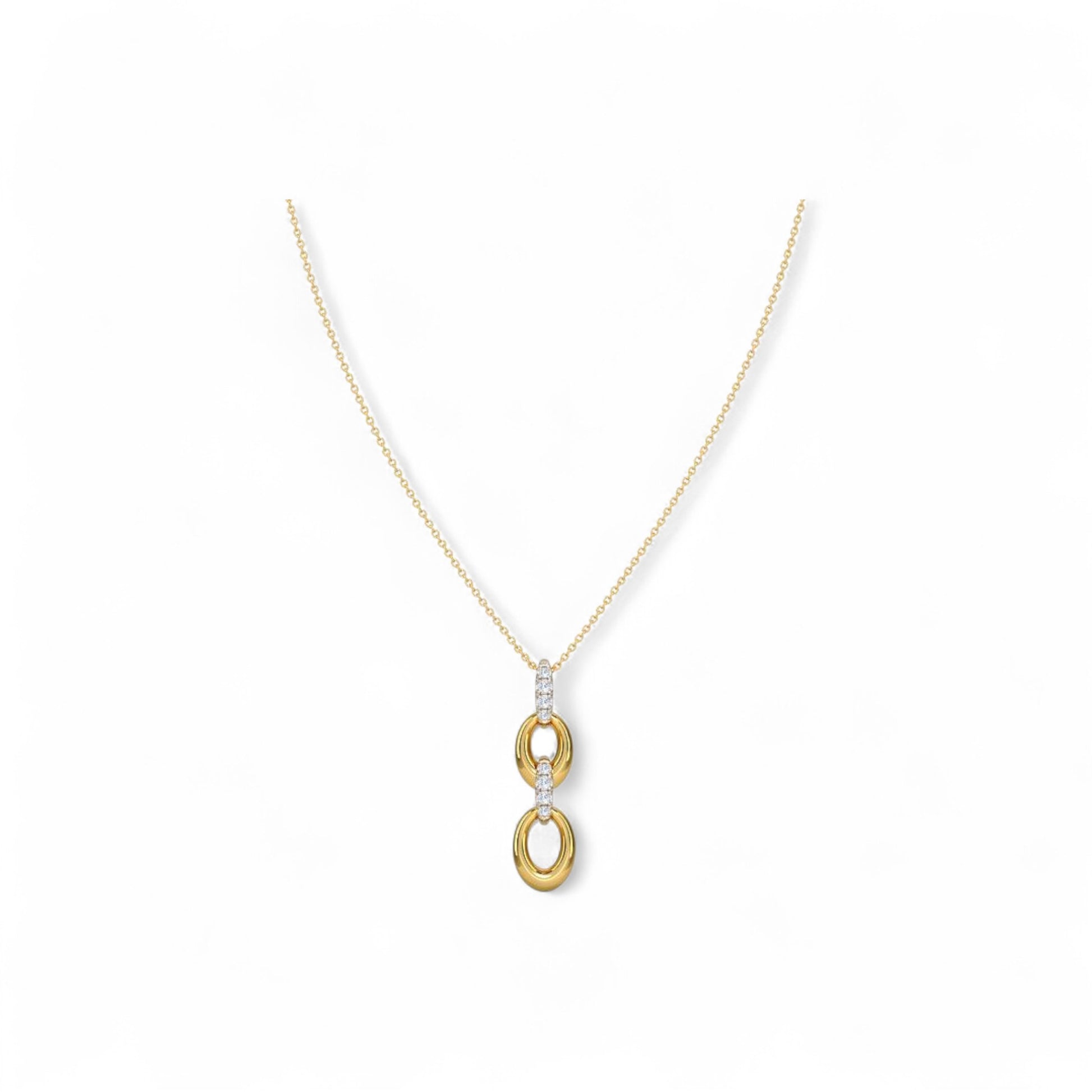 Elegant and architectural, the Joan Vertical Diamond Necklace in 18K Gold embodies timeless sophistication with a modern twist. Featuring two interlocking oval links in polished yellow gold, this pendant is accented by pavé diamond connectors that add a touch of radiant sparkle. The graceful vertical composition elongates the neckline, while the 16-inch gold chain drapes delicately across the collarbone. Whether worn as a solo statement or layered for depth, Joan is a celebration of refined simplicity and enduring love, perfect for every unforgettable moment.