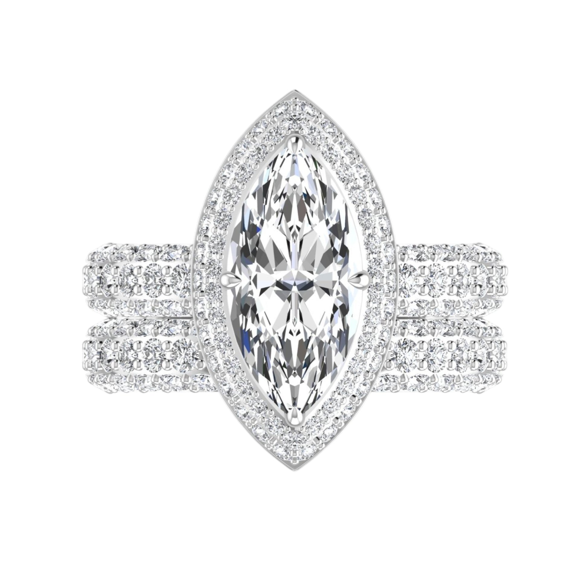 Bold brilliance meets refined elegance in the Amy Marquise Cut Bride Set. Expertly crafted in solid platinum, this striking bridal set features a captivating marquise-cut lab grown diamond framed by a radiant halo of accent stones that amplify its fire and elongated silhouette. The engagement ring is paired with a perfectly contoured diamond wedding band, both adorned with precision-set lab grown diamonds that create seamless sparkle across the finger.