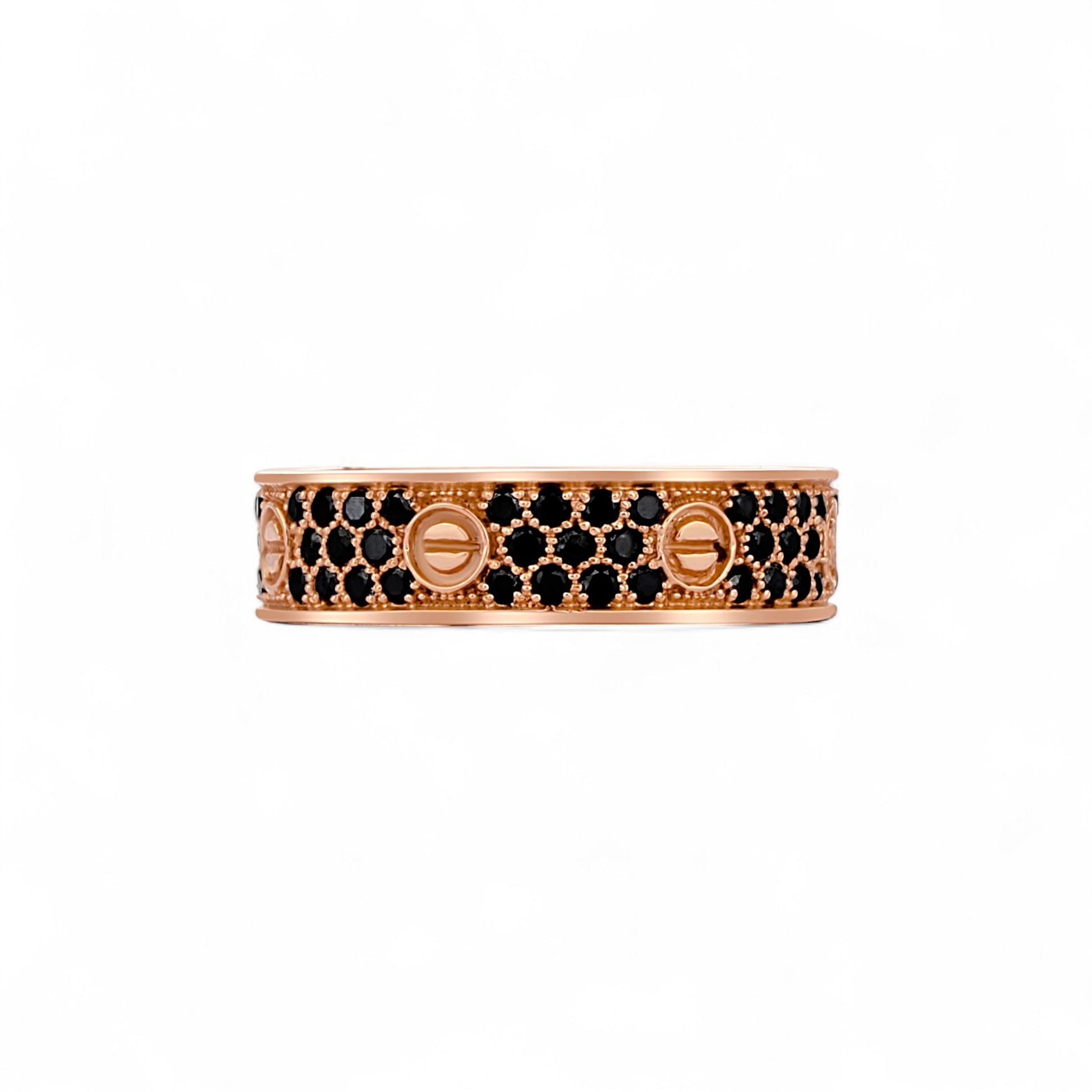The rich contrast between the deep, enigmatic stones and the warm glow of gold makes this band a powerful symbol of strength, passion, and individuality. Whether worn as a wedding ring or a personal style statement, it speaks to a love that’s anything but ordinary.
