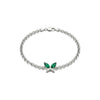 The Emerald and Pink Butterfly Heart Bracelet features a delicate butterfly motif accented with vibrant emerald stones, set along a refined silver chain that sits beautifully on the wrist. Its polished finish and lightweight design create a graceful balance of color and shine, making it an effortless piece for everyday wear or subtle layering with other favorites.