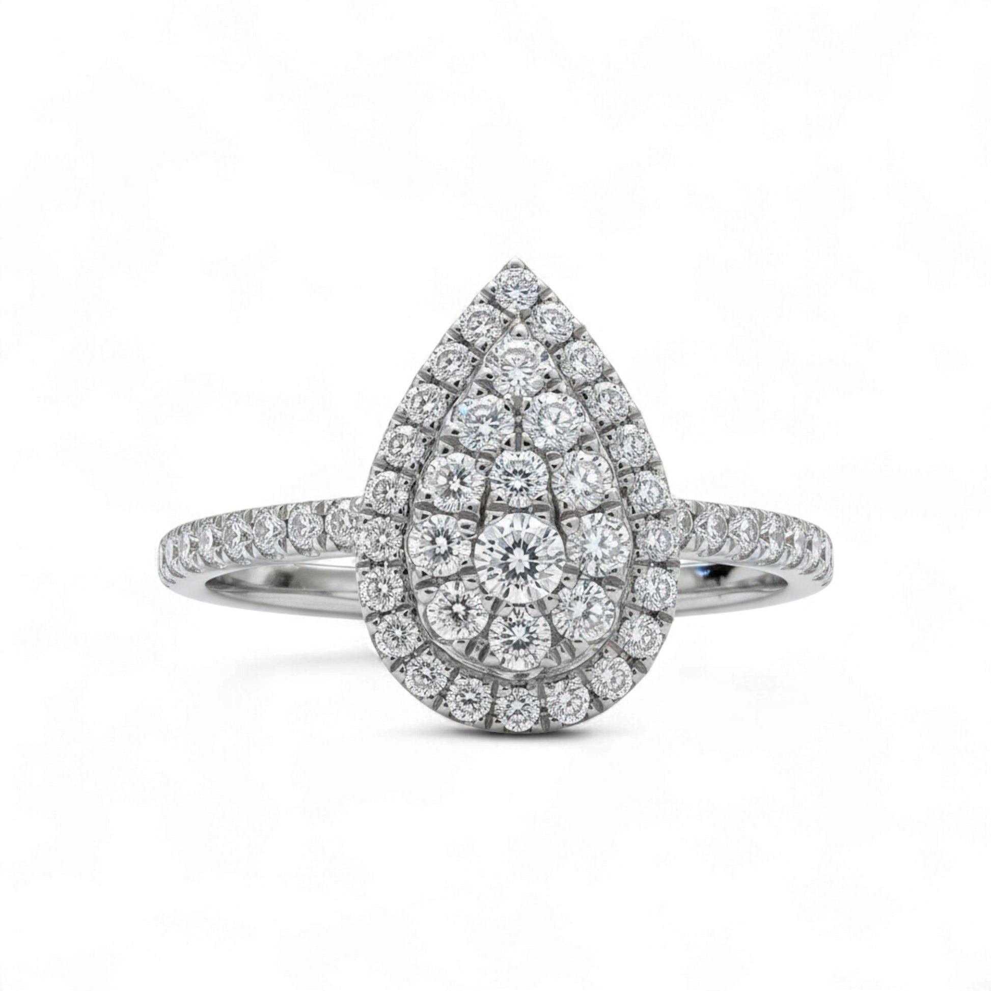 This Julie Pear Cut Natural Diamond Engagement Ring is designed with a pear shaped clustered diamond center framed by a double halo of natural round diamonds for amplified brilliance and depth. The tapered pear silhouette elongates the finger with elegant presence, while the diamond set band enhances the ring with continuous shimmer and elevated luxury.